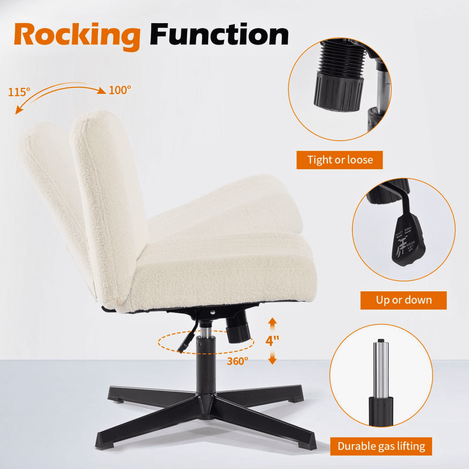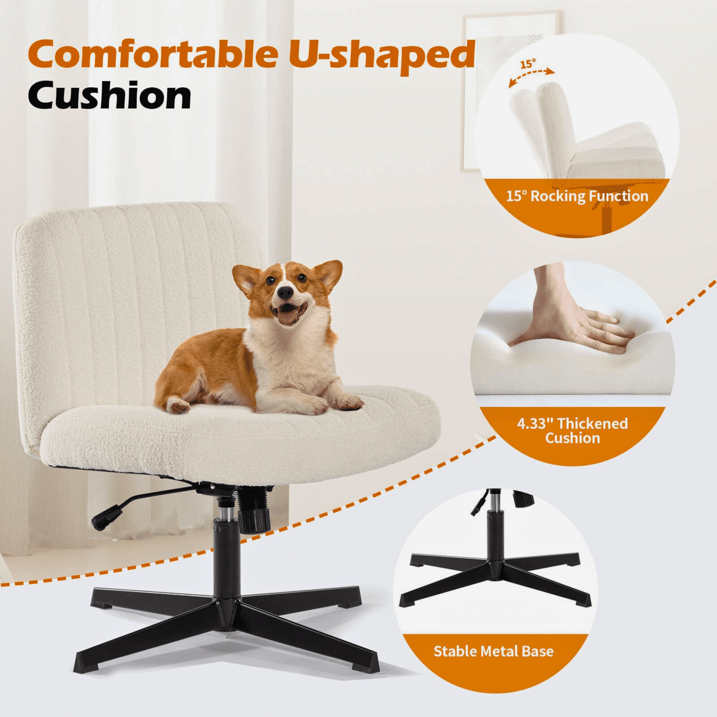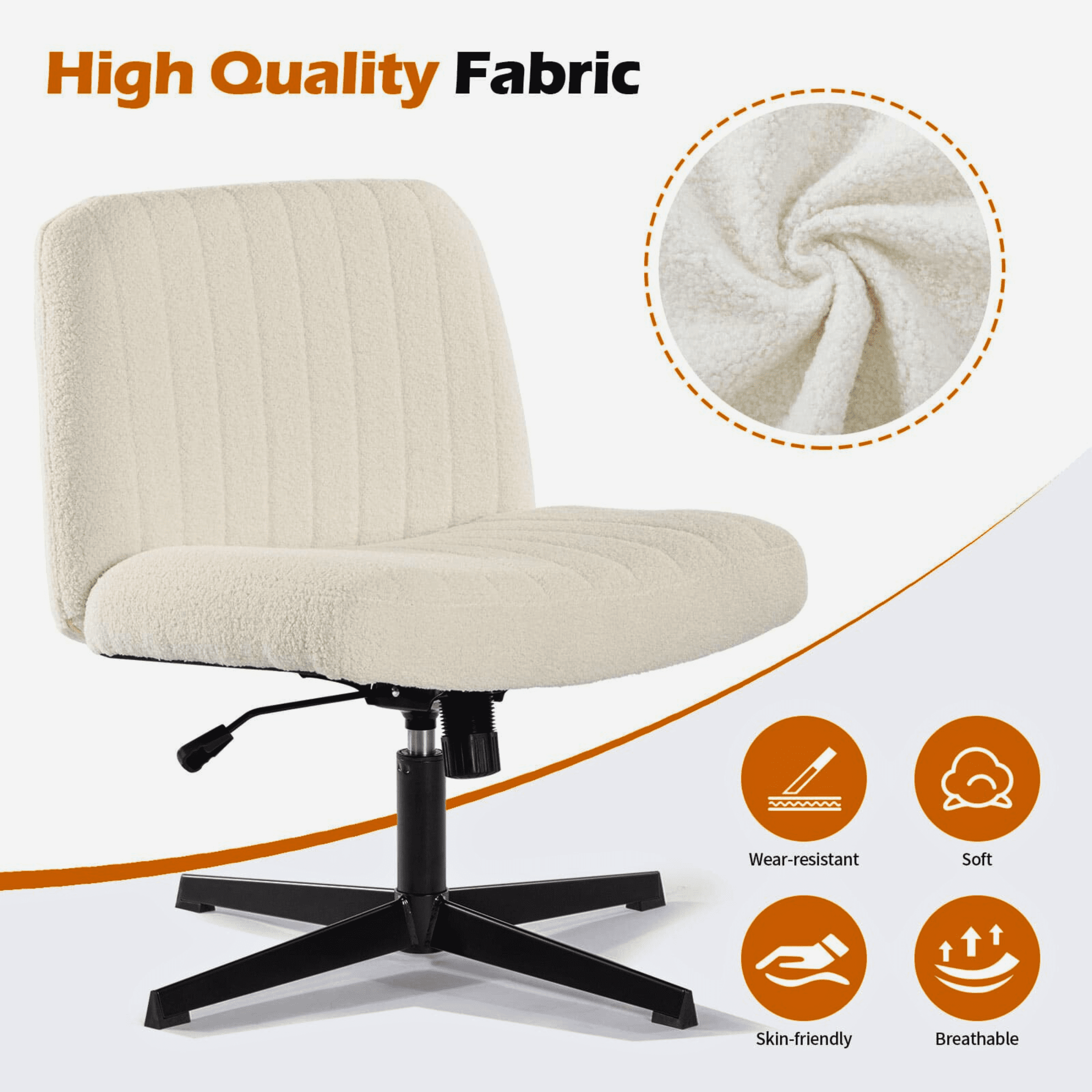 Absolutely love the chair, comfy but gives you enough support, wide so I can cross my legs, super easy to put together, nice creamy color and nice-touch fabric, worth every penny!