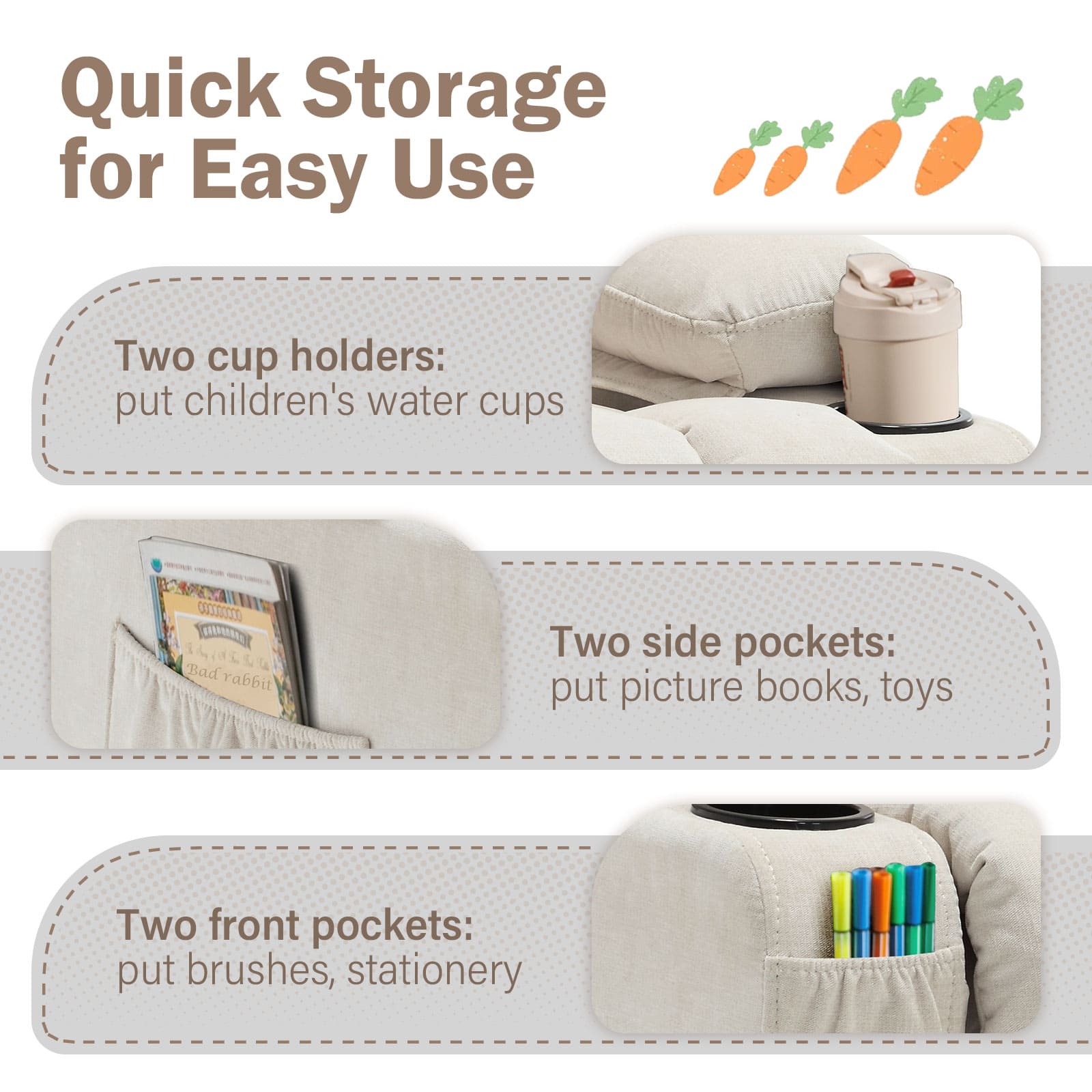 The recliner chair is designed for children, made with a sturdy wooden frame structure, stable when lying or sitting, not easy to tip over, filled with soft fabric, and breathable, long sitting or long lying won't feel stuffy and uncomfortable. Native sponges are hygienic, highly elastic, and highly supportive.