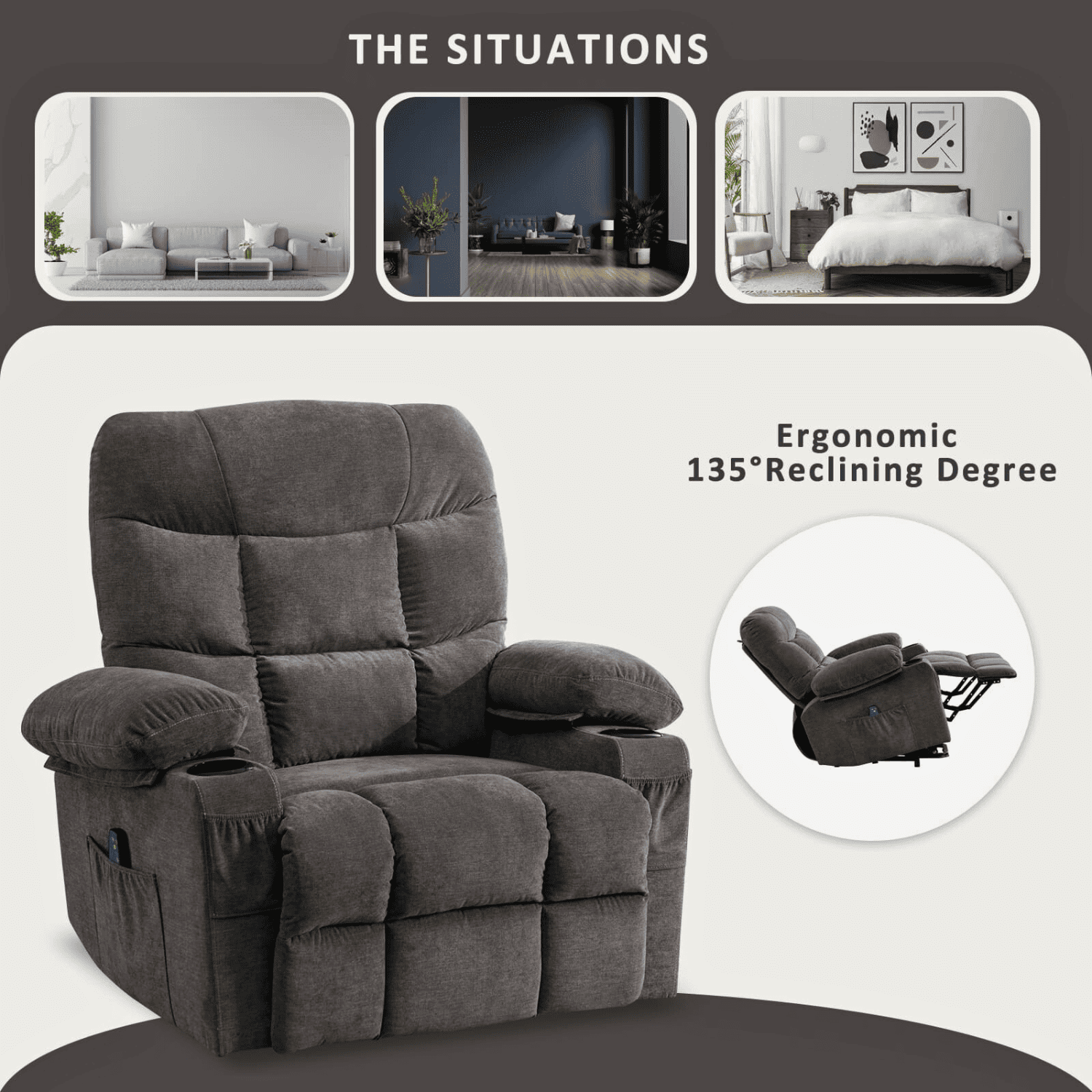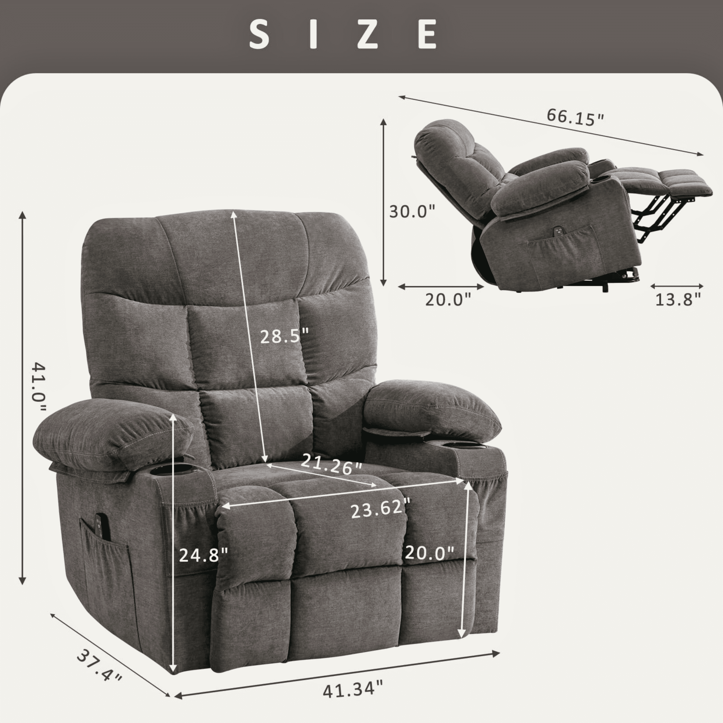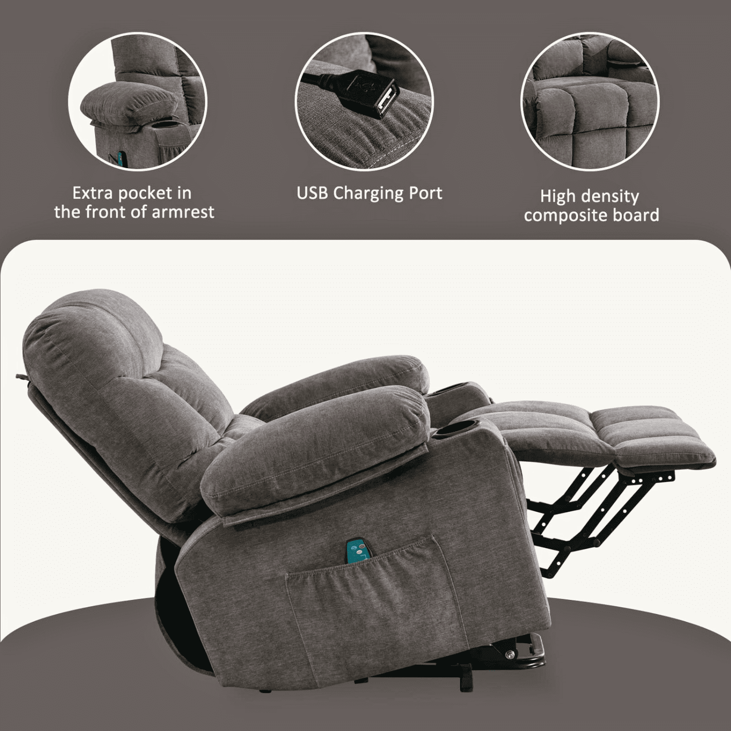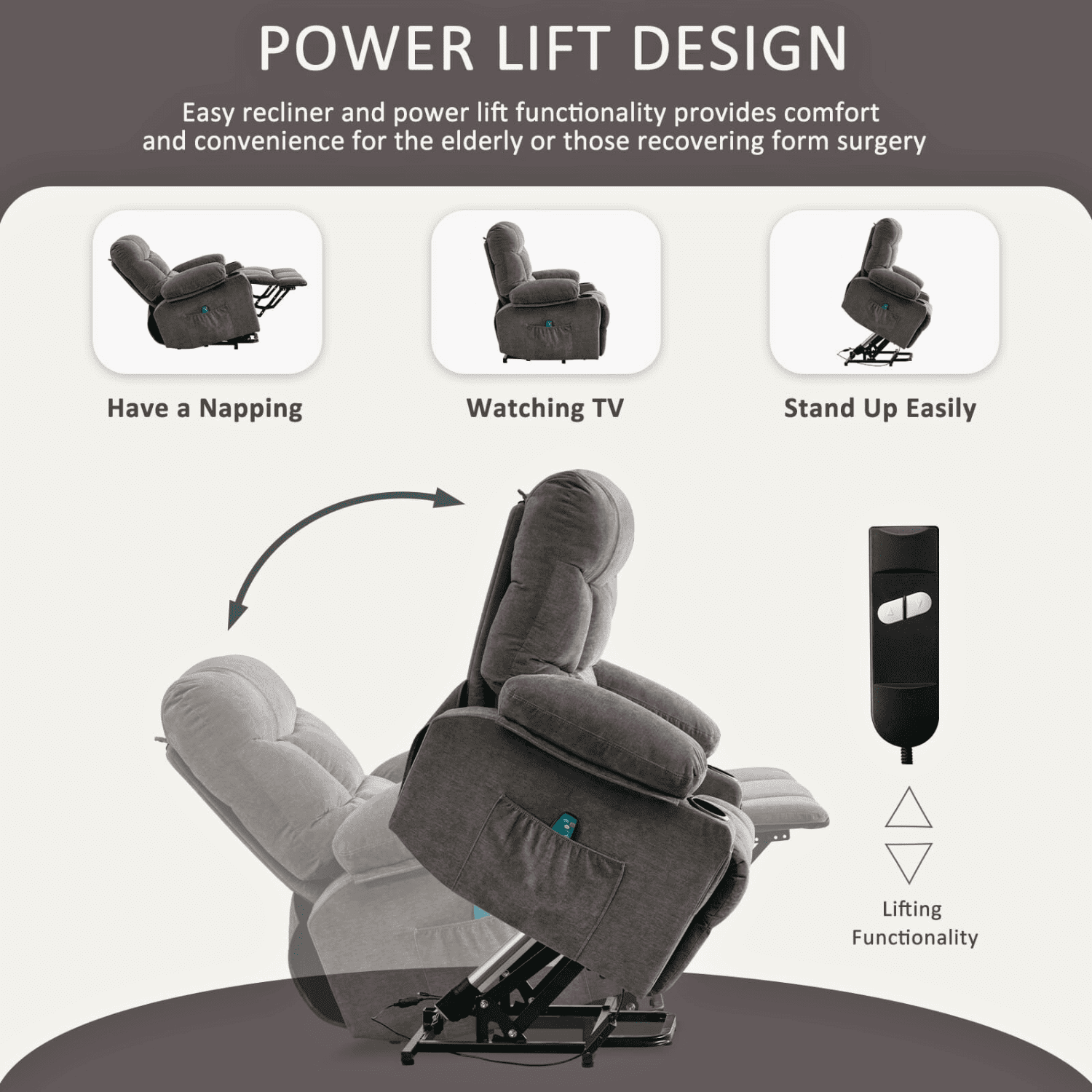 The recliner chair has a power lift function that gently raises it from the base, offering a convenient way to stand up while minimizing back and knee strain.
